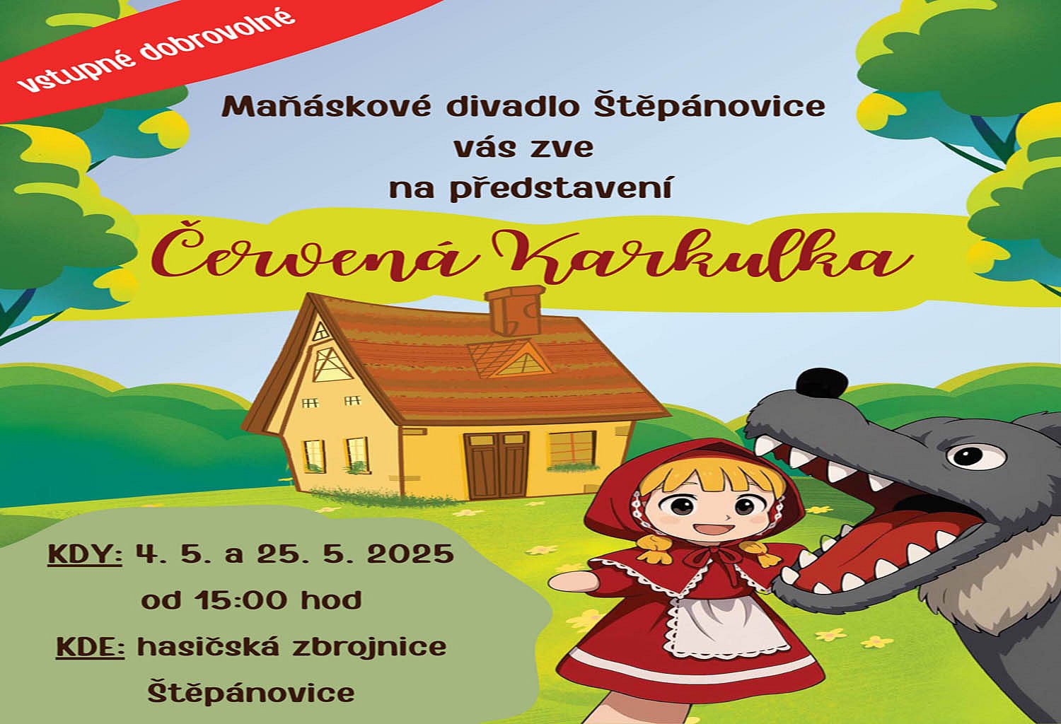 Nedělní odpoledne patřilo nejen dětem, ale i rodičům a prarodičům. Na velkém sále hasičárny se konala premiéra maňáskového divadla - pohádka o Červené Karkulce. Za tímto nápadem stojí naše členky Jitka Beránková, Eva Wirthová, Milada Toušová a Petra Ondrejková ve spolupráci s Hankou Bouřilovou a Irčou Křížkovou. Na hezké představení se přišlo podívat 94 hostů a holky byly odměněny velkým potleskem. I my jsme rádi, že naše prostory mají další a další využití. Kdo s Vás ještě pohádku neviděl nebo se chce podívat znovu může využít druhý termín představení a to v neděli 25. května 2025 od 15.00 hod. na sále naší hasičárny.